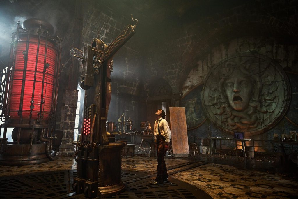От нового масштабного полотна мастера трудно отвести взгляд, даже несмотря на внушительный хронометраж. В первую очередь из-за характерной черты работ Гильермо дель Торо – невероятной тщательной проработки мельчайших деталей фильма, каждую из которых так и хочется разглядеть. И это касается не только декораций и антуража, как, например, в лаборатории Виктора (Оскар Айзек), где любой замысловатый механизм так и приковывает внимание, но и костюмов с яркими акцентами. Таким выразительным элементом стала красная повязка на шее Франкенштейна, появившаяся на герое после смерти его матери, предпочитавшей красный в одежде. Этот платок становится символом одержимости учёного идеей, возникшей в том числе из-за гибели любимой матушки, и постоянно напоминает о цели персонажа, выделяя его на фоне основной зелёной палитры фильма и словно медленно удушая протагониста. Но стоит Виктору воплотить в жизнь свой план и, подобно Богу, сотворить жизнь, его яркий аксессуар исчезает.